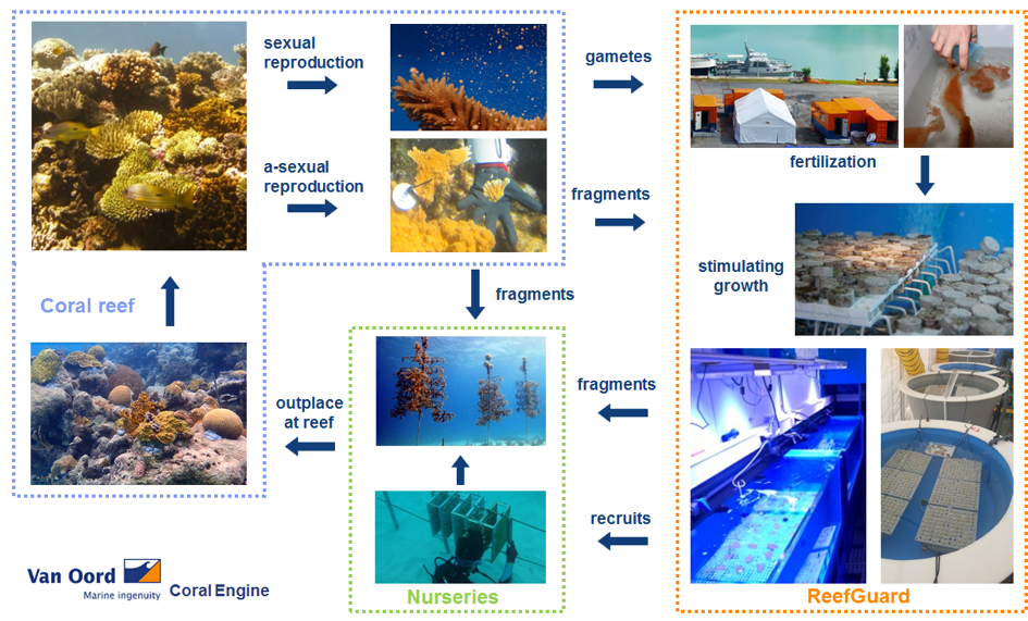 Figure 2. Coral propagation via fragmentation and sexual reproduction using Van Oord’s ‘ReefGuard’ facility.